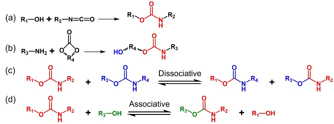 Hydroxy-urethane vitrimers are usually prepared via reaction of polyols with isocyanates (Scheme 4a). Alternatively, isocyanate-free polyhydroxyurethanes could be prepared from cyclic carbonates (Scheme 4b). Network rearrangement of hydroxyl-urethane vitrimers could be attributed to two factors: the dissociative carbamate exchange reaction (Scheme 4c) [