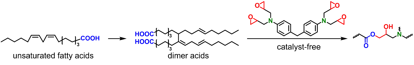 Considering that zinc catalysts are corrosive and may harm the environment, our research group developed a catalyst-free vitrimer based on dimer acids and a glycidyl amine epoxy resin (Scheme 8) [