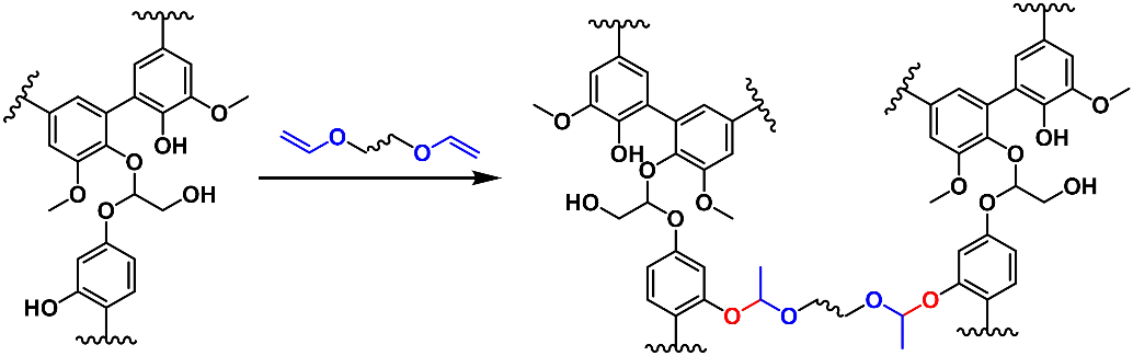 115]. The aldehyde groups (from vanillin moieties) in the grafted lignin were then crosslinked by diamines to produce dynamic networks, which can be used as self-healing adhesives.