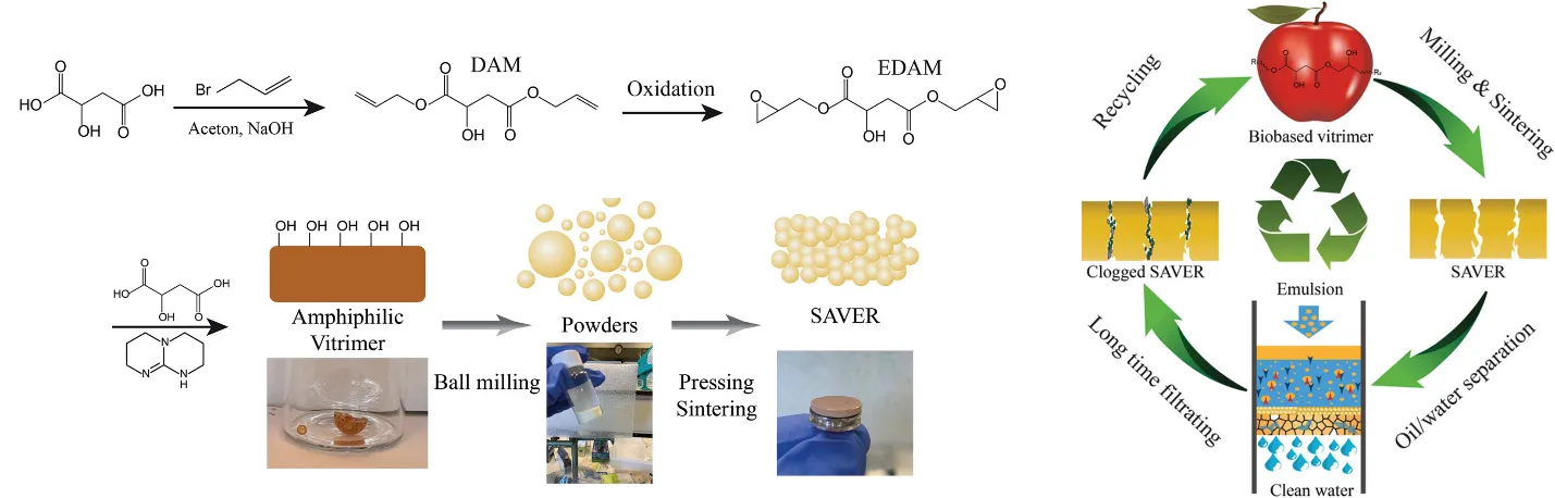 . Biobased amphiphilic vitrimer with a closed-loop life cycle and its use in oil-water separation. (Reprinted with permission from Reference [