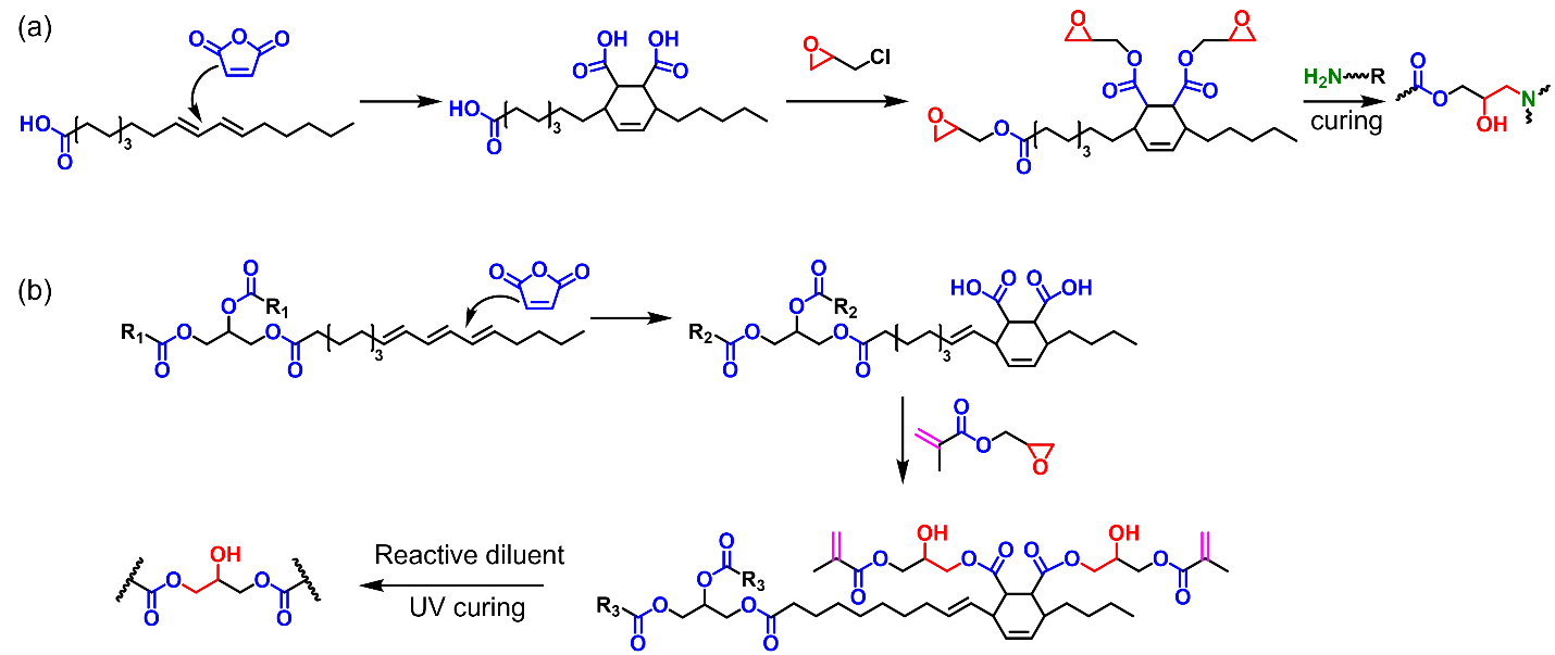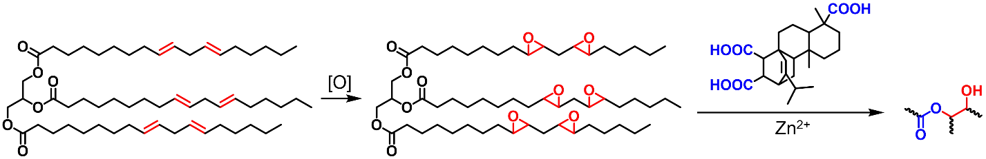 Vegetable oils and fatty acids could be modified in a few ways and used in hydroxy-ester vitrimers. Dimerization or trimerization of fatty acids through double bond addition reactions will produce polymeric fatty acids, which could be used as curing agents for epoxy vitrimers (Scheme 8). Vegetable oils could also be epoxidized and used as multifunctional epoxies (Scheme 9). For example, epoxidized soybean oil (ESO), a commercially available product with a well-established market, is often used as a multifunctional epoxy in vitrimer synthesis. Vegetable oils with higher degrees of unsaturation could be converted to polymer precursors via the Diels-Alder reaction (Scheme 10).