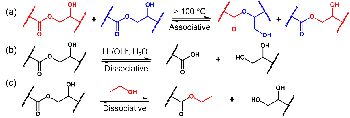 29]. In order to recycle these vitrimer materials, it is often necessary to decompose the polymer networks via dissociative bond cleavage of the dynamic crosslinks. For example, in vitrimers containing hydroxy-ester crosslinks, dynamic transesterification reactions between the esters and hydroxyl groups at high temperatures (>100 °C) enable network rearrangement and impart repairability, reprocessability, and shape changing properties to the materials (Scheme 2a). When end-of-life products need to be recycled, hydrolysis of the ester crosslinks in acidic or alkaline solutions could be used to disrupt the network structure (Scheme 2b). Alternatively, treatment in a large excess of alcohol also leads to decrosslinking of the polymer network (Scheme 2c). Notably, this process is reversible and the network could be reconstructed by removing the alcohol under heating [