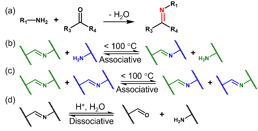 52]. Imine exchange (Scheme 5b) and imine metathesis (Scheme 5c) endow polyimine vitrimers with stress relaxation, malleability, and self-healing properties [