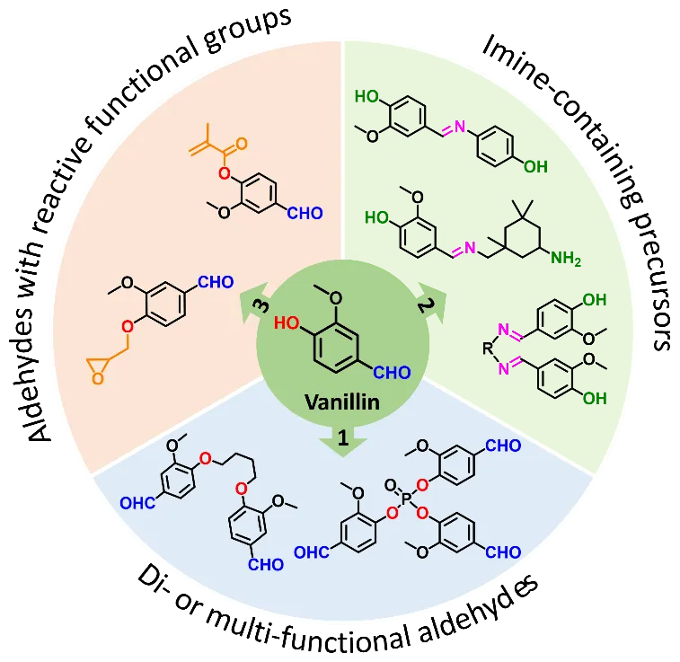 Due to the limited natural availability of aldehydes, most reported biobased polyimine vitrimers are derived from vanillin and its analogues. Vanillin is a phenolic aldehyde found in vanilla bean and can be produced on large scale from lignin [