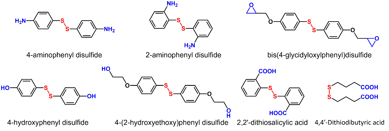 Vitrimers based on disulfide exchange are often prepared by introducing monomers containing disulfide bonds into the resin system. lists several commonly used disulfides [