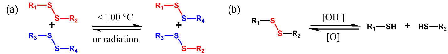 57]. In addition to disulfide exchange reactions (Scheme 7a) that endow materials with typical vitrimer properties (self-healing, shape changing, reprocessing, etc.), disulfide bonds can also be decomposed by alkaline or reducing agents (Scheme 7b). As a result, vitrimers based on disulfide metathesis can be chemically degraded at room temperature into oligomers in aqueous solutions of sodium hydroxide or trialkylphosphines [