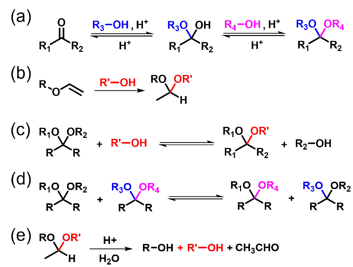 Scheme 6. (<b>a</b>) Acetal formation from aldehydes/ketones and alcohols. (<b>b</b>) Acetal formation from vinyl ethers and alcohols. (<b>c</b>) Trans-acetalization reaction. (<b>d</b>) Acetal metathesis. (<b>e</b>) Acid-catalyzed acetal hydrolysis.