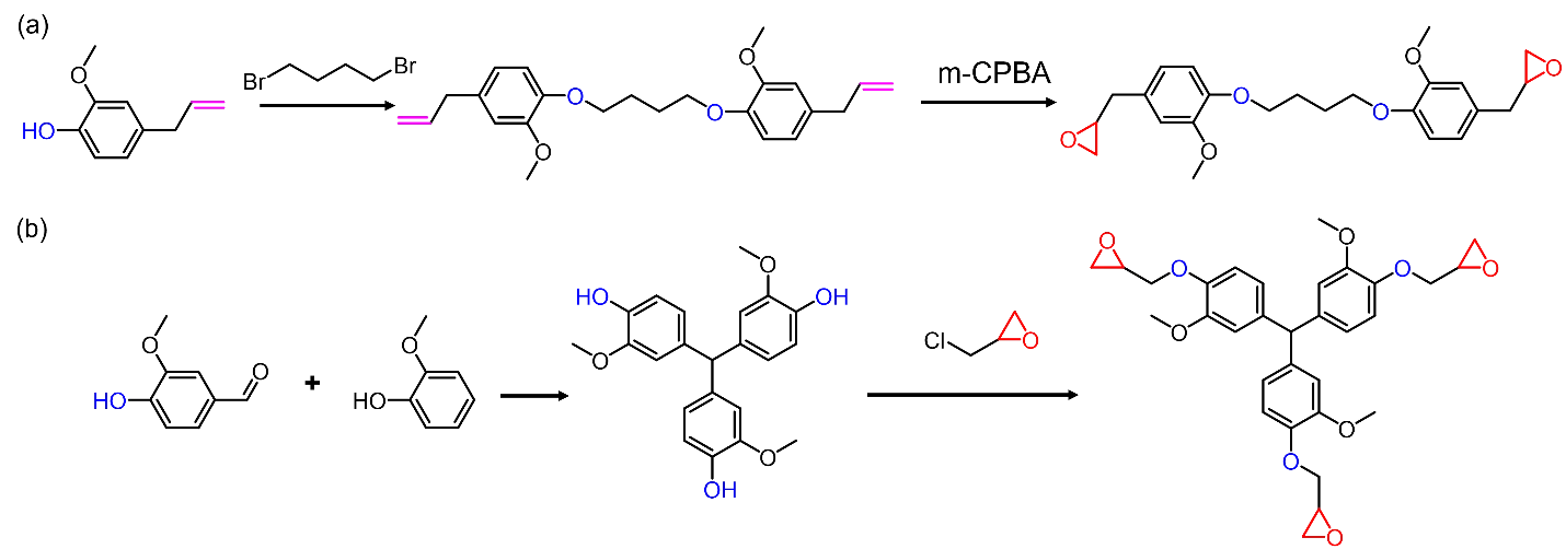 Our research group prepared eugenol-based (Scheme 18a) and guaiacol-based (Scheme 18b) epoxy resins and reacted them with anhydride curing agents to prepare vitrimers, respectively [