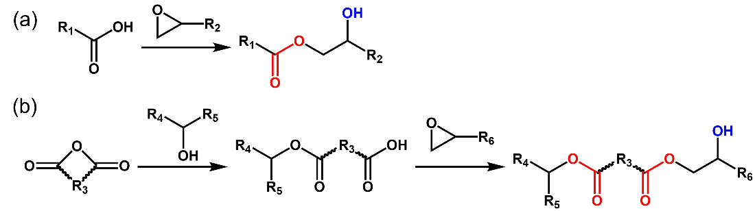 Hydroxy-ester vitrimers contain a large number of ester bonds and hydroxyl groups. Most hydroxy-ester linkages are prepared by the ring opening reaction of epoxies with carboxylic acids (Scheme 3a) or anhydrides (Scheme 3b). It is often necessary to add a certain amount of catalysts (>5 mol% of epoxy groups) to promote the curing reaction as well as transesterification. These catalysts mainly include Lewis acids (zinc acetate, zinc acetylacetonate, stannous octoate, etc.) [
