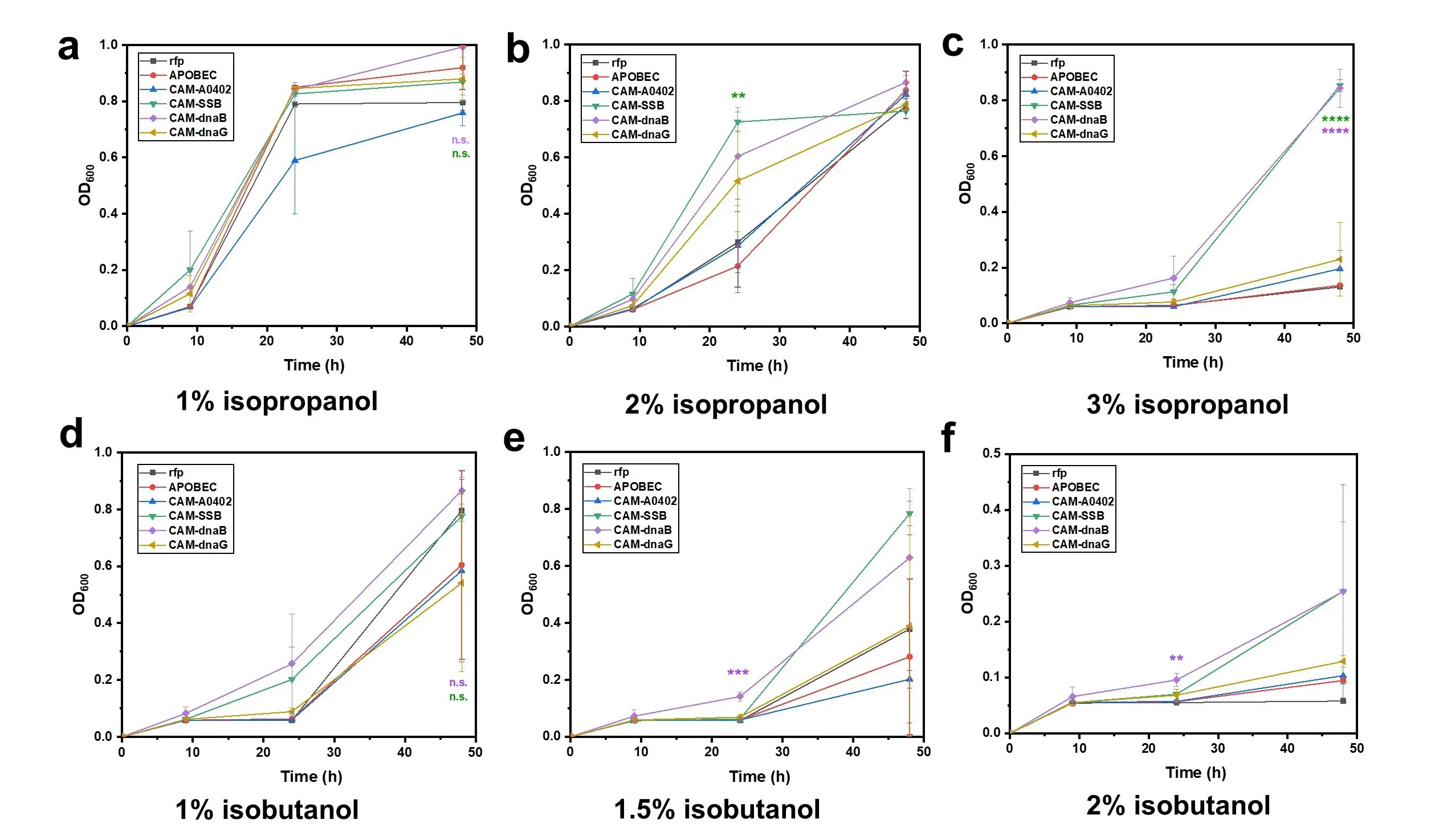 Seed cultures of four CAM strains and two control strains, C5/rfp and C5/APOBEC, were prepared as described above for determining relative mutation rates. Following two rounds of induction and mutation accumulation, 60 μL seed culture was inoculated into 3 mL LB or LB containing different concentrations of isopropanol (1%, 2%, and 3%) or isobutanol (1%, 1.5%, and 2%) in 24-well plates. 2 mg/mL arabinose was added to induce CAM and control gene expression. Optical density at 600 nm was measured at 9 h, 24 h, and 48 h after inoculation. Each experiment was repeated at least twice, and the representative results were shown (the trend remained consistent).