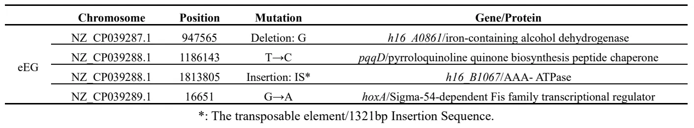 Three single colonies of eEG (eEG1, eEG2, and eEG3) were isolated and cultured to mid-log phase for whole genome sequencing. Genomic DNA was extracted with SDS method [