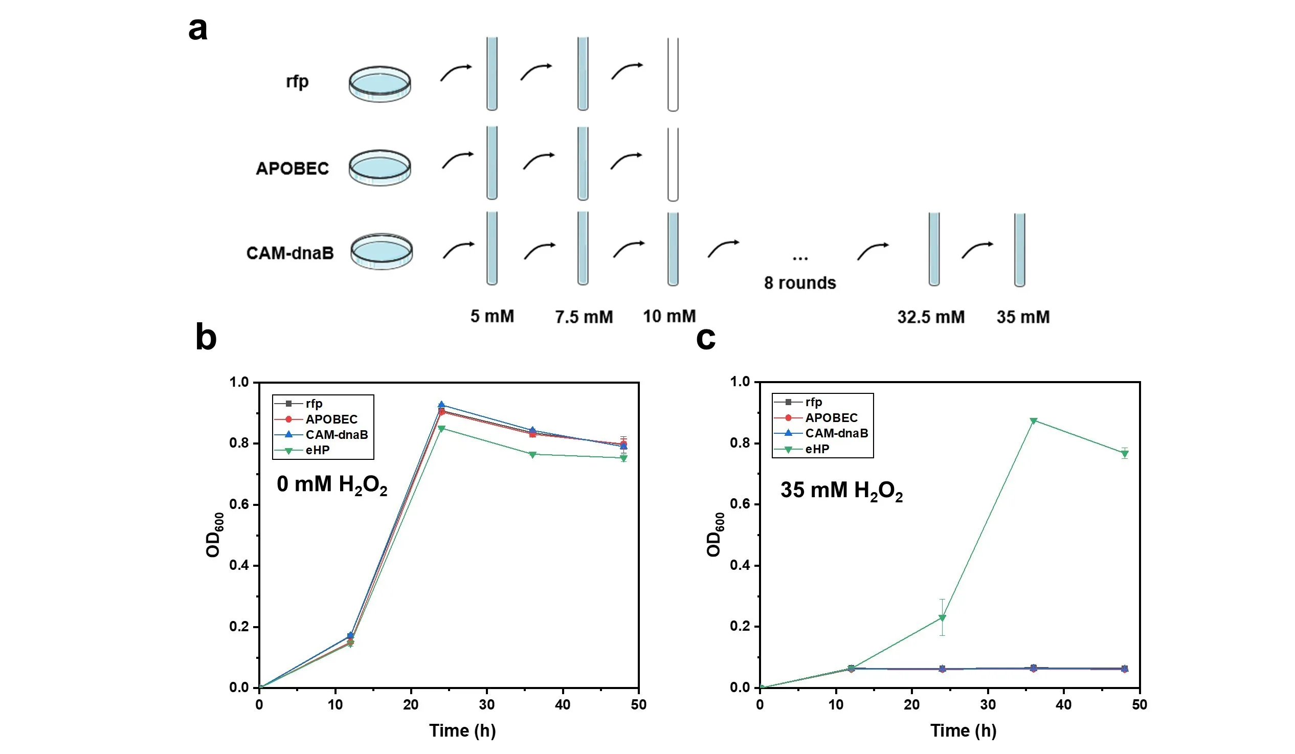 2 increased by 2.5 mM every 36–48 h until reaching 35 mM. After 12 rounds of evolution, three individual dnaB-evolved clones (named eHP1, eHP2, and eHP3) were isolated and evaluated in LB medium and LB medium containing different concentrations of H