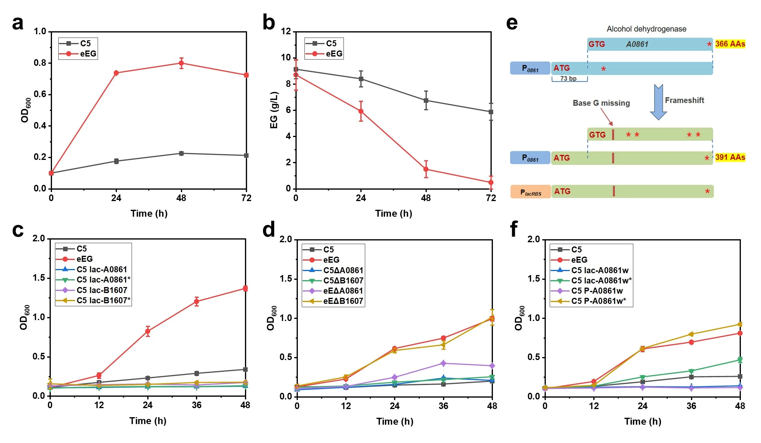 2. For EG utilization evolution, seed culture was inoculated into MSM medium containing 10 g/L EG as the sole carbon source and subculture (5% inoculation to the same medium) was performed every 72 h. After three generations of evolution, an obvious growth advantage with C5/CAM-danB was seen over the control C5/rfp. Three individual clones (named eEG1, eEG2, and eEG3) were isolated for verification and whole genome sequencing.