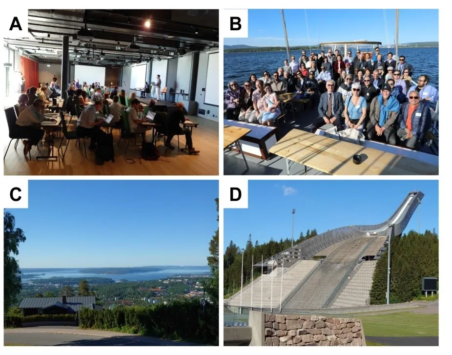 . Impressions from the 12th International Workshop on the CCN Family of Genes. (<b>A</b>) Participants engaged in discussions about the latest findings in the field of CCNs. (<b>B</b>) Attendees of the CCN workshop enjoying a boat trip on S/V Legend along the coast of the Oslo Fjord. (<b>C</b>) View from the conference venue. (<b>D</b>) The Holmenkollbakken at Holmenkollen in Oslo, with a hill size of 134 m (440 ft).