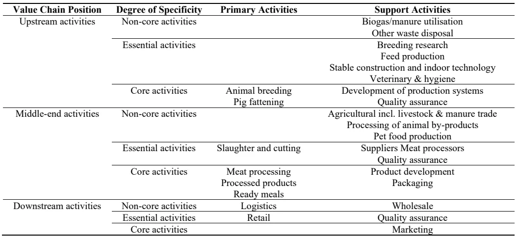50]. Accordingly, at each location of the value chain(s), i.e., upstream, middle, and downstream, one can differentiate non-core, essential, and core as well as primary and support activities. Even non-core support activities like processing of animal by-products might well be important for the competitiveness of the production system, and could become crucial for value chain transformation.