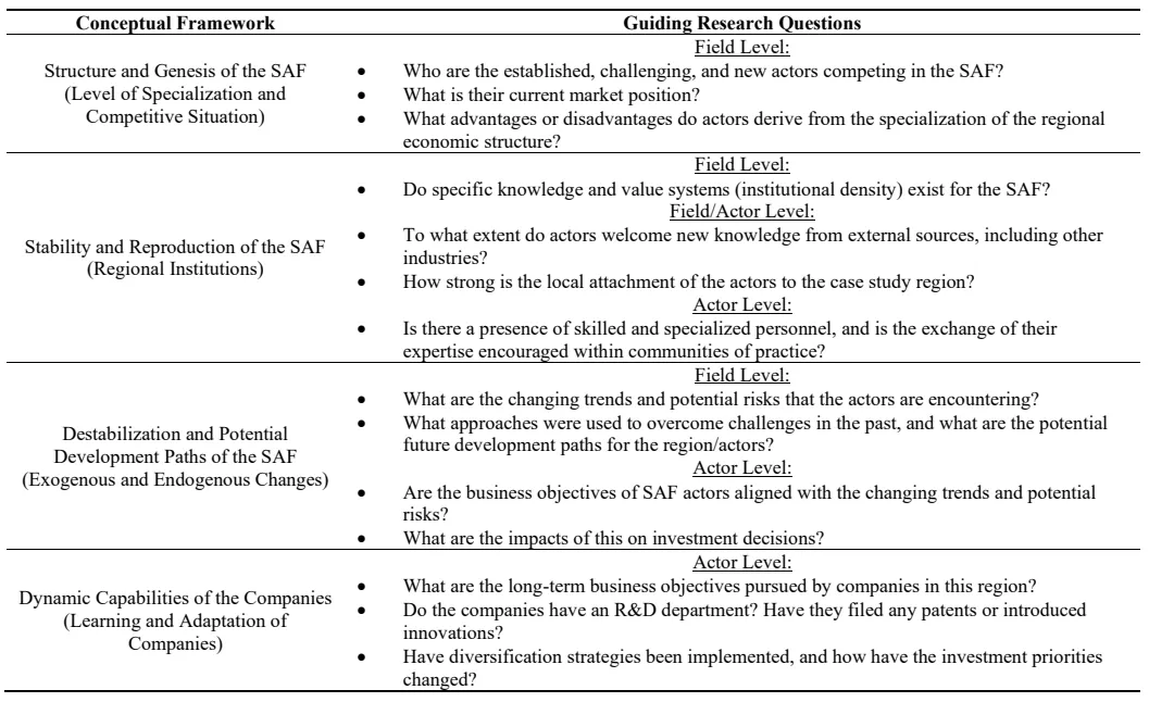 The interviews aimed to gain insight into the structure, dynamics, and transformation capacity of the SAF. The interviews followed a deductively developed conceptual framework based on the theories outlined in Chapter 2. depicts this framework that directed the interview structure and provided the basis for formulating guiding research questions. If required, a differentiation was drawn between questions targeted at the field level and those that were directed toward the actor level.