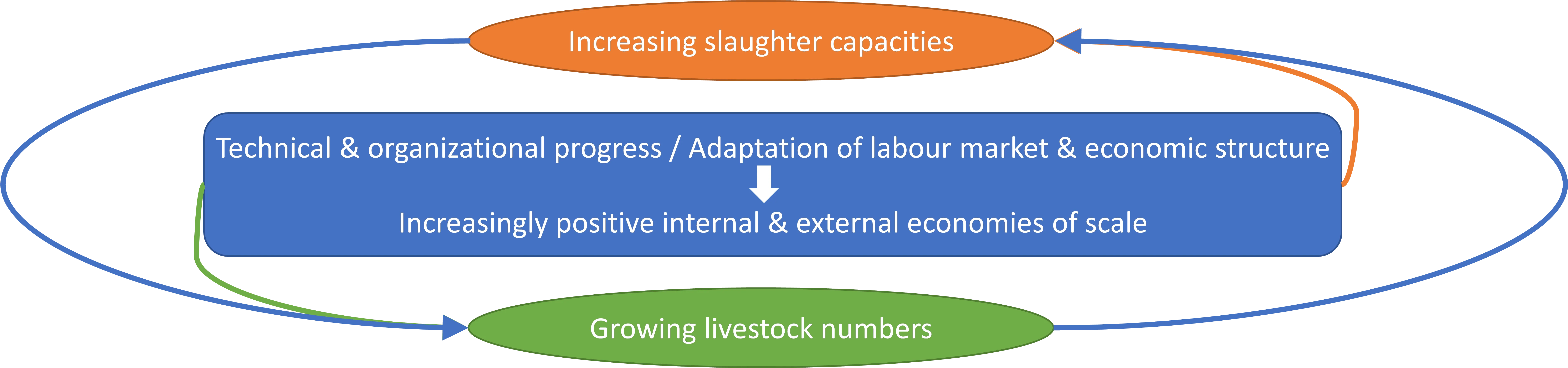 . The positive mutual reinforcement in growth between livestock-production and slaughter capacities.