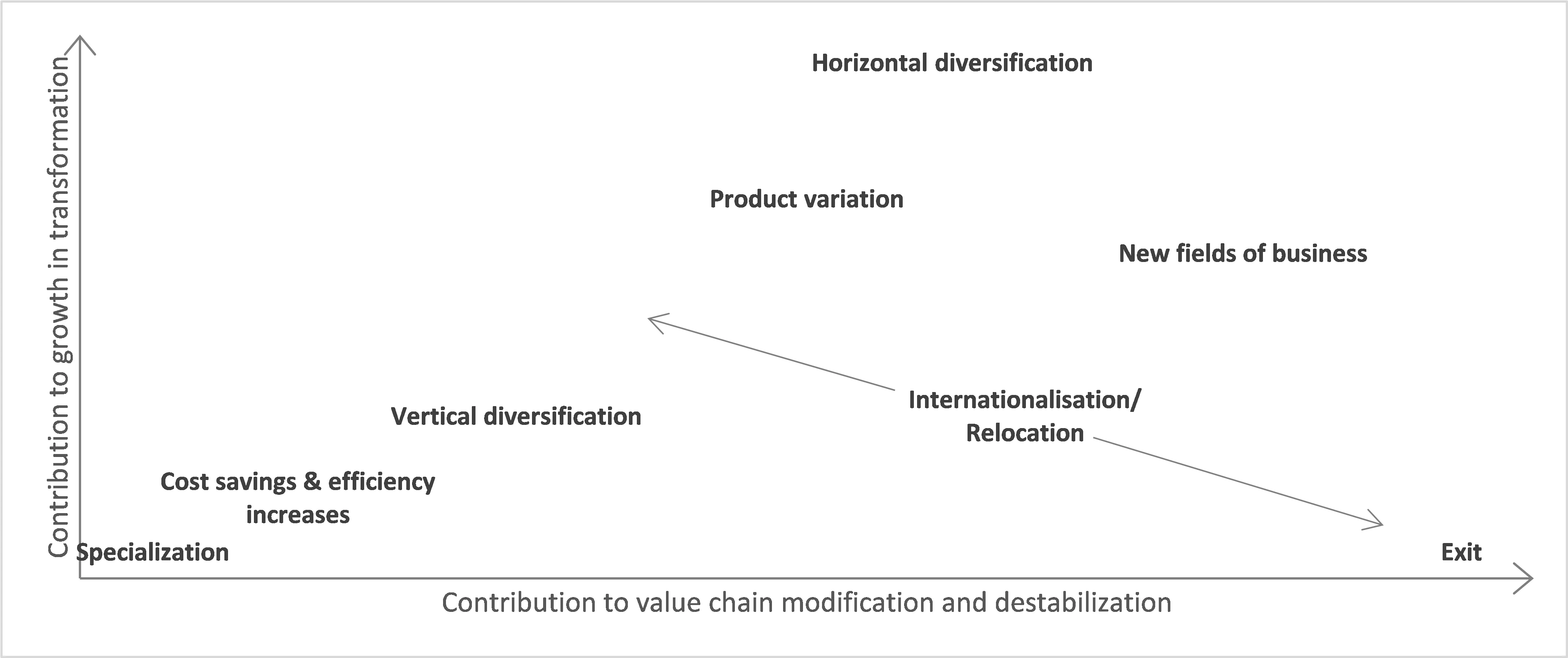 20]. Even if businesses possess valuable resources and the necessary dynamic capabilities, successful transformation may be impeded without sufficient support in their environment. Value chains are an important part of the institutional environment of companies, but the conventional view of linear value chains oversimplifies their complexity and the diverse activities at each stage. The Global Value Chains (GVCs) approach has highlighted the coordination or governance of value chains and their dependence on structure [