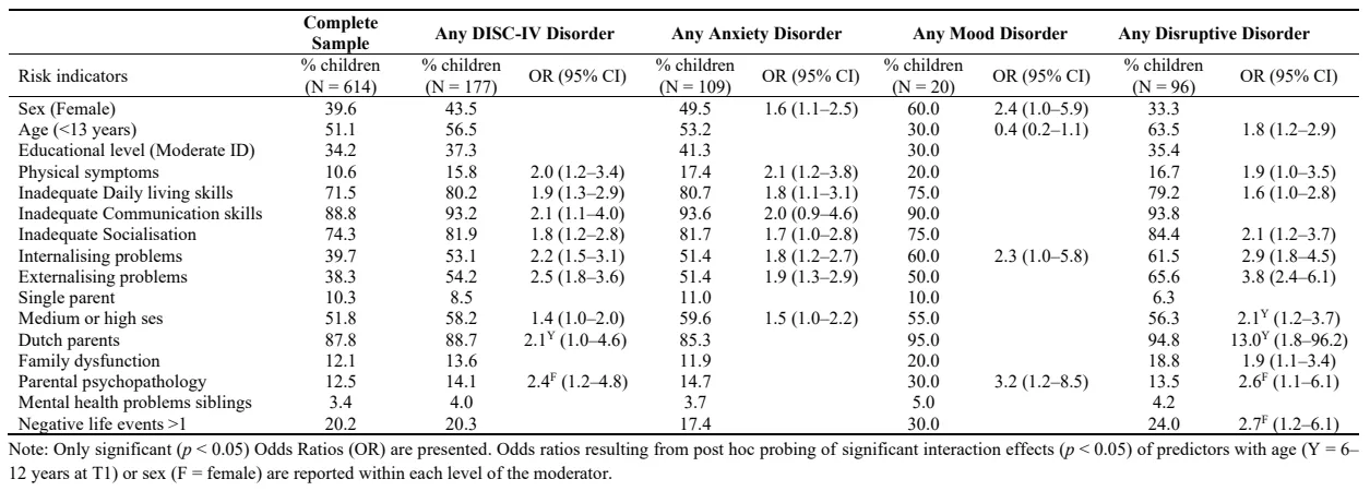 shows the percentage of children exposed to each risk indicator, and the significant Odds Ratios within each level of the moderator variables age and sex whenever a significant interaction effect was present. All included factors except child educational level (mild vs moderate ID), single parenthood, and mental health problems in siblings were significantly related to one or more of the psychiatric disorder clusters. Only four significant interaction terms were found inconsistent across the four clusters.