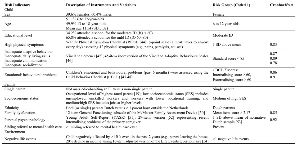 29], who looked into the 1-year predictive value of these child and family factors for the development of DSM-IV disorders in children and adolescents with ID using part of this same sample. In our study, independent and important risk indicators at the child level were internalising and externalising problems, inadequate communication skills, and at the family level and parental psychopathology. The previous study showed that the strongest 1-year predictive associations with DSM-IV disorders came from child social incompetence, inadequate daily living skills, health problems, emotional and behavioral problems, parental mental health problems and parent-reported negative life events. Apparently, next to child behavior problems, child/adolescent communication skills gain importance for predictive significance over this longer period. The risk indicators for psychopathology identified in this study are quite similar to those found for children and adolescents in the general population. In addition, inadequate daily living skills, specifically, inadequate communication skills, appeared as important predictors. It seems that with the increasing demands for independent functioning encountered during adolescence, these factors come to play a significant role in the development of mental health problems.