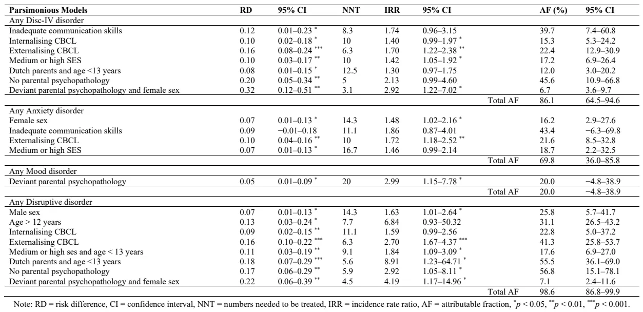 presents the RDs, NNTs, IRRs and AFs of the parsimonious models described above. The risk indicators of the parsimonious models resulted in total AFs of 86.1%, 69.8%, 20.0%, and 98.6%, indicating the percentage of the cases of any DSM-IV, any anxiety, any mood and any disruptive disorder, respectively, that can be identified with these risk profiles.