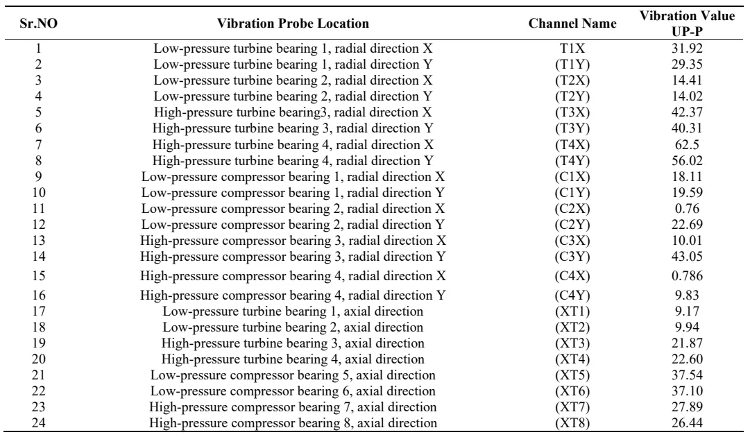 The blade tip timing analysis option was also checked. The blade tip timing is not measured in this study because it is necessary to have vibration probes mounted on the casing at the blade level. However, it is essential to look into the machine’s health. Blade tip timing is one of the most promising methods for determining the frequency of blade vibrations. Traditionally, strain gauges installed on the blades are used to monitor the response of rotating blades. The non-interference stress measurement system (NSMS), or blade tip timing, is a non-invasive, non-contacting substitute for strain gauges. This method measures each blade’s motion using probes typically optical ones mounted on the engine housing. As a result, it is unaffected by most strain gauge drawbacks. A maximum of four probes can be considered [