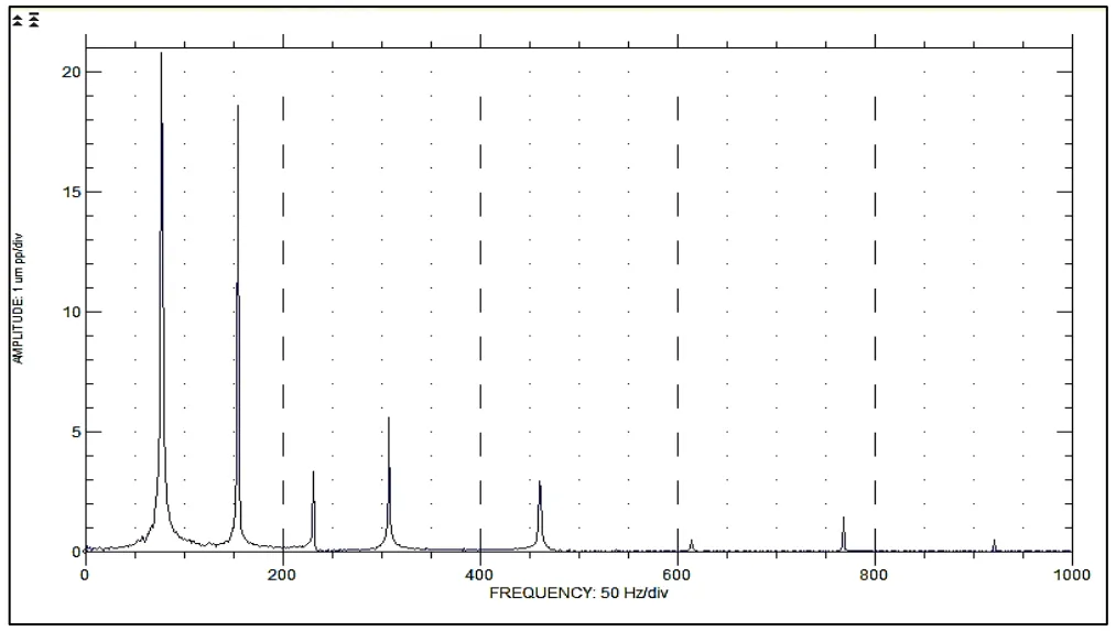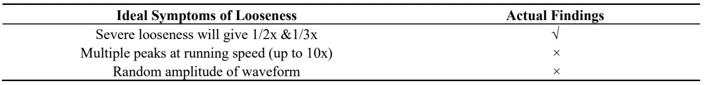 Looseness can be attributed to worn or oversized fluid-film bearings or loose bearing support. In cases of looseness, the structural elements or bearings within the machinery experience excessive play or lack proper support. This can result in unintended movement or shifting of components, leading to vibrations with characteristic frequencies. demonstrates the looseness symptoms and findings. While the loosness specturm is illustrated in .
