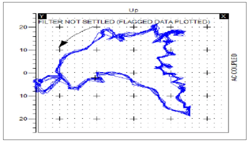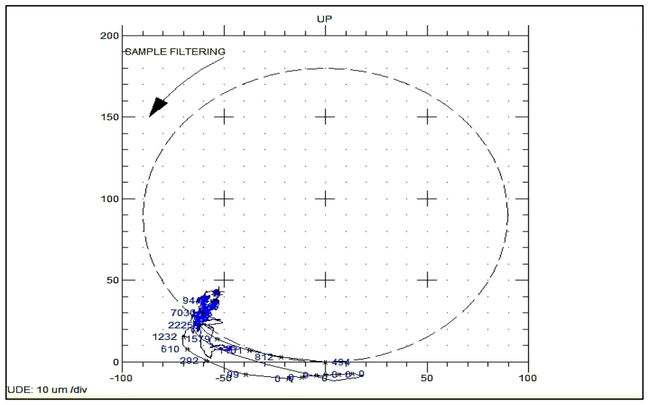 In the last phase, orbit plot analysis is performed, as shown in . Orbit plot displays only the dynamic motion. The purpose of the orbit plot is to show the two-dimensional complete motion of the rotor. It demonstrates the path of the rotor shaft centerline. The misalignment signs are observed during the analysis of the orbit of the machine train. Further, it is also found that there is slight ovality in the orbit.