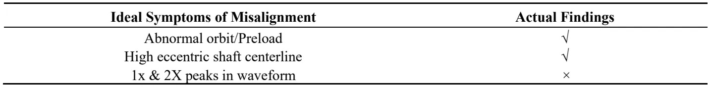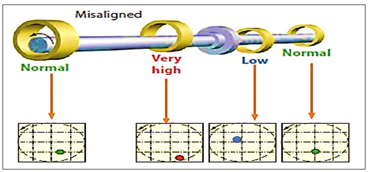 In cases of misalignment, certain symptoms often occur in pairs, indicating the effects of misalignment on adjacent components. For instance, a bearing that experiences overloading due to misalignment is likely to have an underloaded neighbouring bearing. This pattern highlights the uneven distribution of forces resulting from the misalignment condition. Another misalignment indicator is the average eccentricity ratio, which can be high in one bearing and low in an adjacent bearing. This disparity in eccentricity ratios signifies the uneven distribution of loads and misalignment-induced forces across adjacent components. The shaft centerline position may also exhibit a specific quadrant in one bearing and the opposite quadrant in an adjacent bearing. This discrepancy in shaft centerline positions further underscores the impact of misalignment on neighbouring components, emphasizing the interconnected nature of symptoms associated with misalignment. The misalligned shaft has been demonstrated in .
