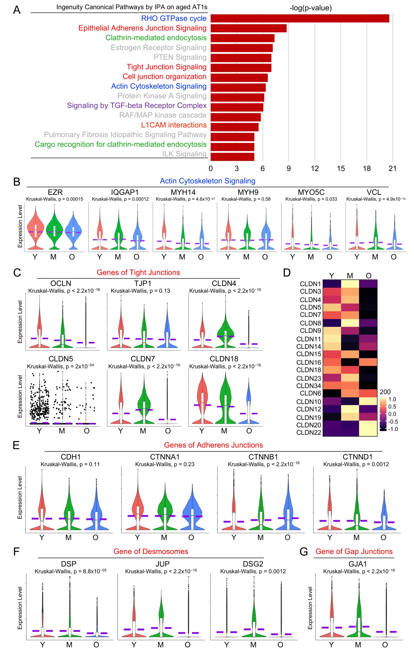 There are three major types of cell junctions: tight junctions, adherent junctions and desmosomes, and gap junctions and almost all require association with the actin cytoskeleton. To verify the dysregulated actin cytoskeleton and cell junction signaling, we then examined the transcriptional levels of the representative actin cytoskeleton genes and the major components of each cell junction complex in AT1 cells from different stages (B–G). Many of the actin cytoskeleton component or intermediate genes were downregulated in the aged AT1 cells (B). Tight junctions consist of transmembrane proteins (Claudins/