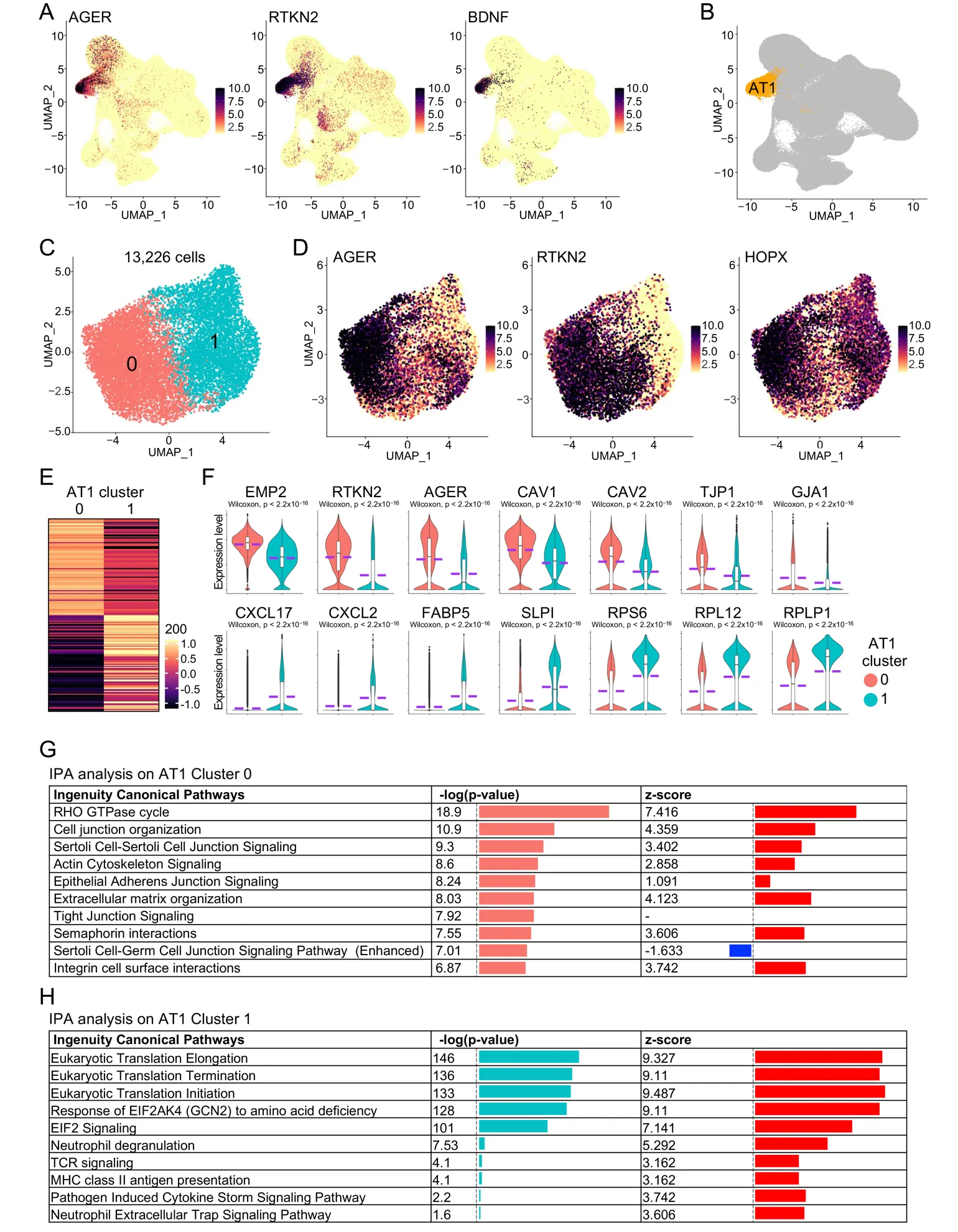 30] and identified an AT1 cell cluster by examining the expression of canonical AT1 marker genes (A,B). We then isolated and re-clustered the AT1 subset, removed contaminant cells, and ultimately retained 13,226 purified AT1 cells in two distinct sub-clusters (C,D). Differential expression analysis revealed unique gene expression profiles for each AT1 sub-cluster (E). Remarkably, the representative top genes in Cluster 0 were predominantly related to the protein components of epithelial cell membranes and cell junctions, whereas those in Cluster 1 were mainly associated with cell inflammation and ribosomal protein genes (F). To further verify the specific functions of these two sub-clusters, we conducted IPA analysis on the differentially expressed genes of each sub-cluster. As expected, the top signaling pathways in Cluster 0 were primarily related to epithelial cell junction signaling and organization (G). IPA analysis in Cluster 1 identified several top pathways associated with eukaryotic translation attributed to the expression of ribosomal protein genes in this sub-cluster. Additionally, many of the other pathways in Cluster 1 were related to cell inflammation and chemokine storm (H), consistent with the elevated expression of chemokine genes in this sub-cluster (F). These analyses indicate that AT1 cells in healthy human lungs exhibit significant heterogeneity and at least two distinct sub-clusters are identified, each characterized by a unique set of genes and functional properties. This functional divergence underscores the complexity of AT1 cell roles in maintaining pulmonary homeostasis and responding to various physiological and pathological stimuli.