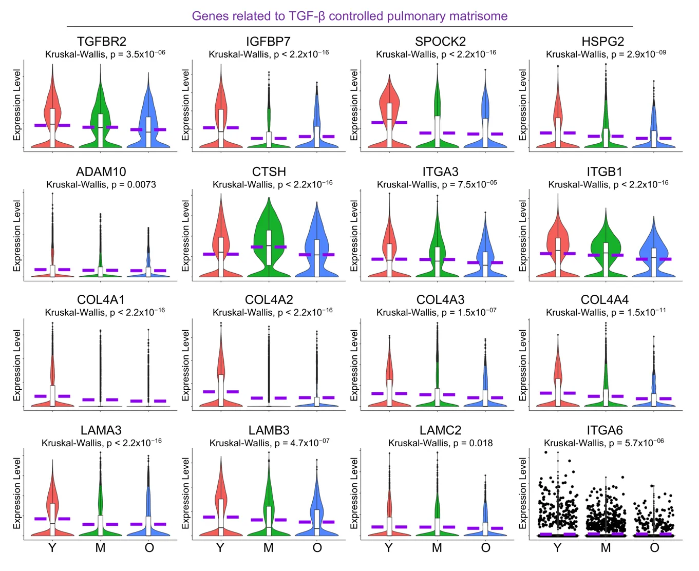 . Deficient alveolar matrisome gene transcription by aged human AT1 cells. Reduced transcription level of <i>TGFBR2</i>, as well as genes related to ECM-related matrisome and Laminin-332 proteins, by aged human AT1 cells was visualized by violin plots. Y, young (Age < 40), M, middle-aged (Age 40–60), O, aged (old) donors (Age > 60).