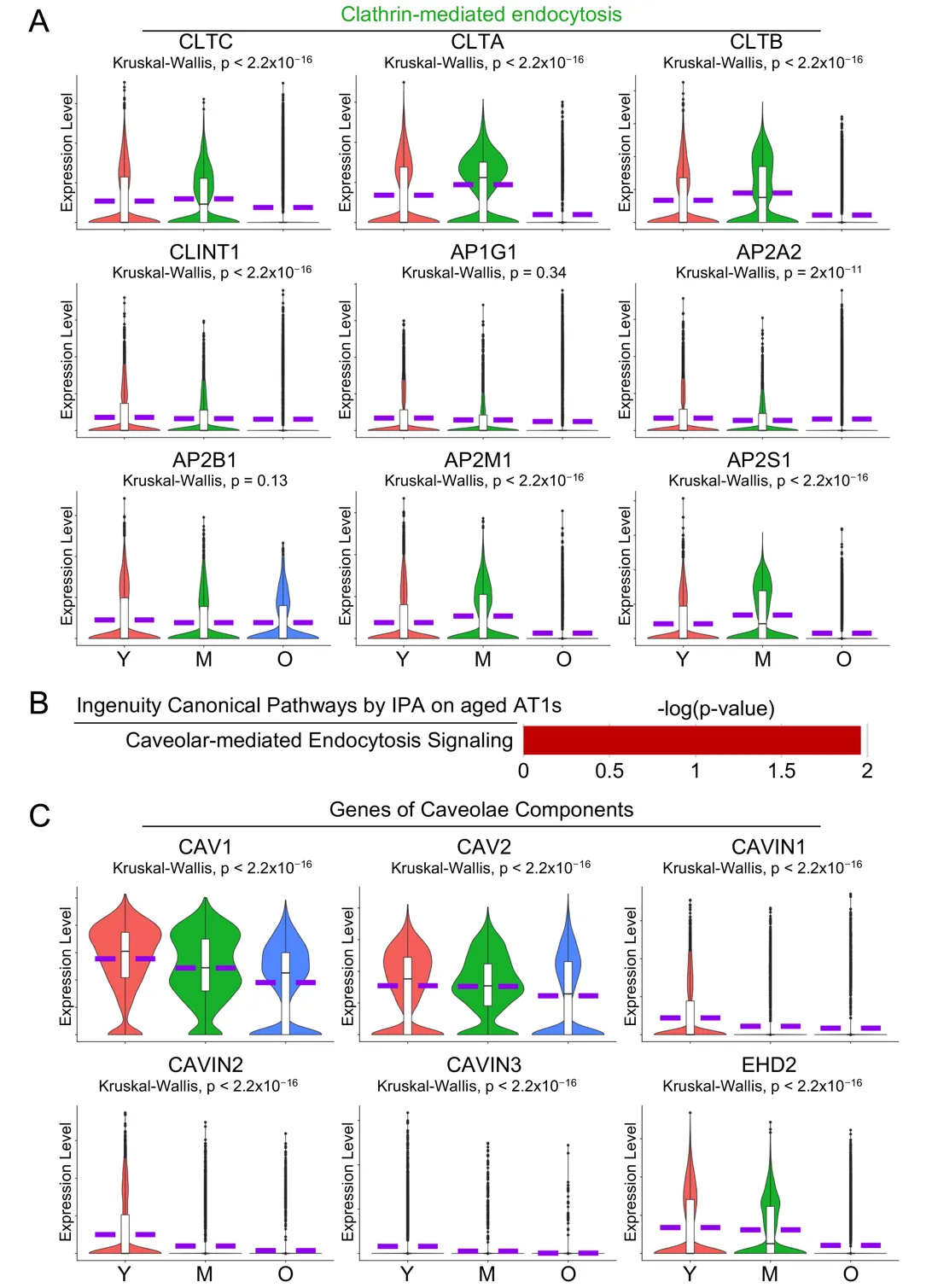 . Impaired cell endocytosis in aged human AT1 cells. (<b>A</b>) Dysregulated Clathrin-mediated endocytosis was visualized by IPA analysis in A, and violin plots showed the expression levels of the major components of Clathrin-mediated endocytosis. (<b>B</b>) IPA analysis suggested dysregulated Caveolar-mediated Endocytosis Signaling in aged AT1 cells. (<b>C</b>) Violin plots displayed the expression levels of the major components involved in caveolar-mediated endocytosis signaling. Y, young (Age < 40), M, middle-aged (Age 40–60), O, aged (old) donors (Age > 60).