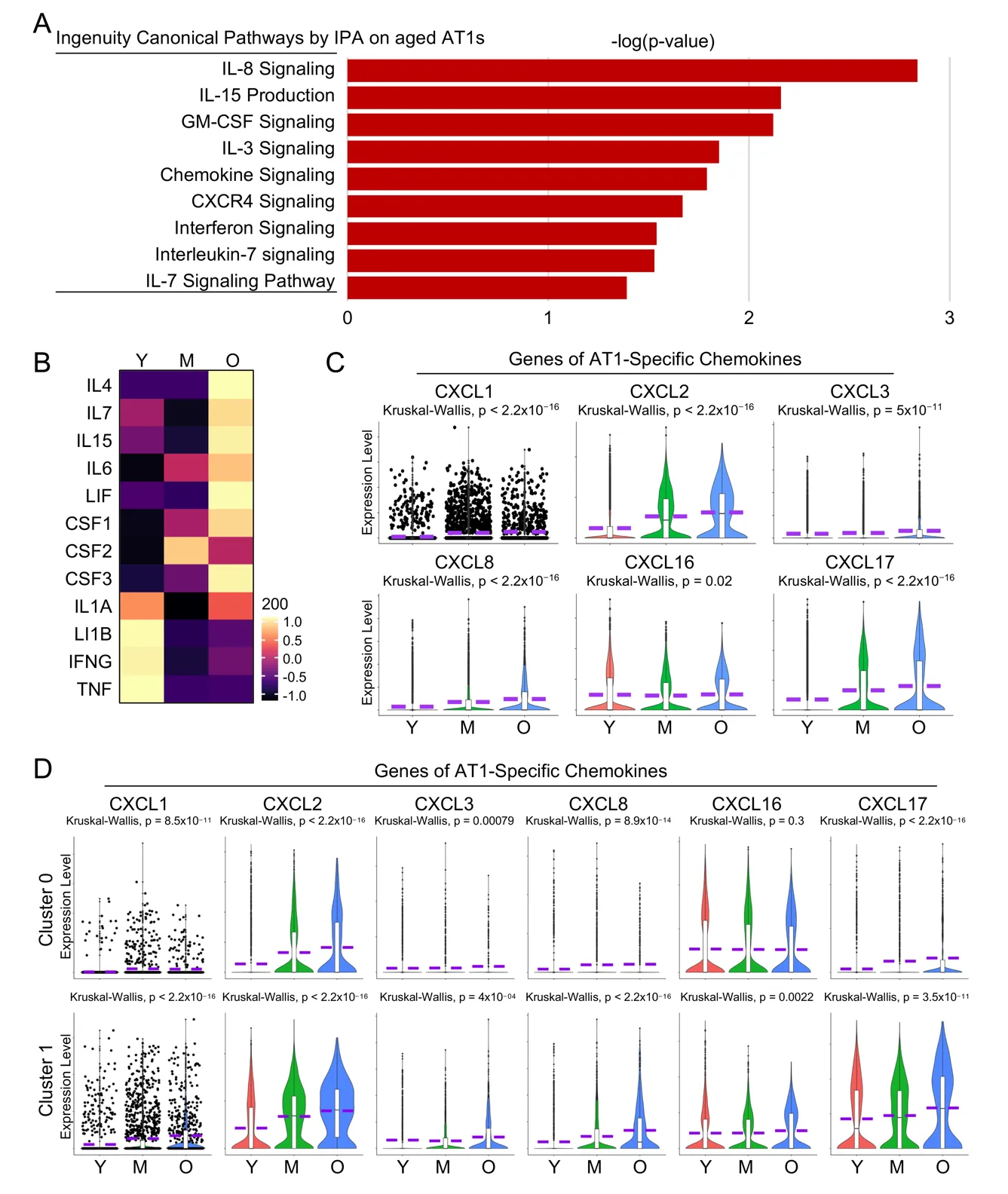 . Increased cytokine signaling in aged human AT1 cells. (<b>A</b>) IPA analysis revealed several elevated cytokine and chemokine related signaling pathways in aged human AT1 cells. (<b>B</b>) Heatmap showed the expression of representative cytokine genes by AT1 cells of different age stages. (<b>C</b>) Violin plots illustrated elevated expression levels of AT1-cell specific chemokine genes. (<b>D</b>) Relative transcriptional levels of AT1-cell specific chemokine genes in AT1 cells of cluster 0 and 1 from different age stages. Y, young (Age < 40), M, middle-aged (Age 40–60), O, aged (old) donors (Age > 60).