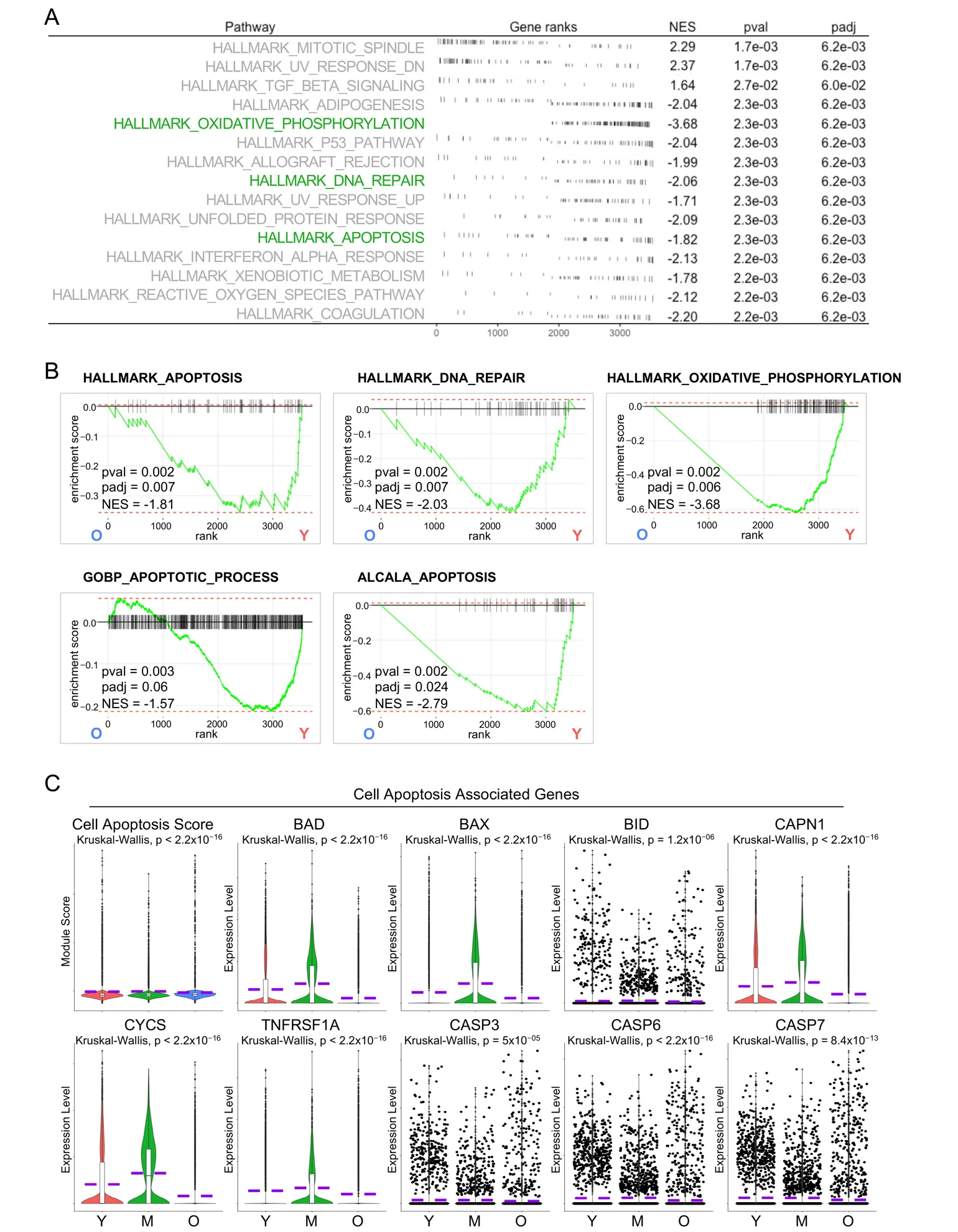 35]. To further study the age-associated change in AT1 cells more systemically, we employed another pathway analysis method, fast gene set enrichment analysis (GSEA). Surprisingly, we identified several cell apoptosis related pathways downregulated in aged AT1 cells by analysis of Hallmark gene sets (A,B). This finding was further corroborated by additional analyses on C2 curated gene sets and C5 ontology gene sets (B). To validate the downregulated cell apoptosis in aged AT1 cells, we accessed the 81 protein-coding genes participating in the apoptosis pathway from the KEGG Pathways dataset and defined the Cell Apoptosis Score. Consistent with our GSEA analysis, the aged AT1 cells exhibited a significantly lower Cell Apoptosis Score and decreased transcription levels of representative cell apoptosis genes (C). These data revealed insufficient AT1 cell apoptosis, indicating impaired turnover of AT1 cells and accumulation of damaged or senescent cells, which may lead to compromised lung tissue homeostasis and functionality in aging human lungs.