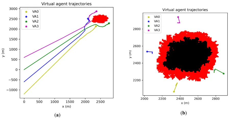 Based on their definition, the fire augmentation and virtual agent area maps are generated based on the fire cells. Each cell of the fire augmentation map is set to True if the corresponding cell of the fire map is True, or if too close to one or more fire cells. The goal is for UAVs to avoid flying over active fire. Hence, the virtual agents must be placed around the fire at a distance larger than the loiter radius