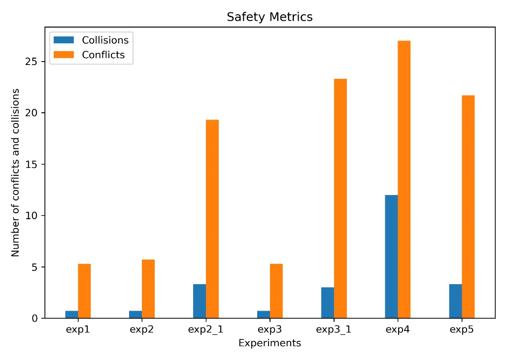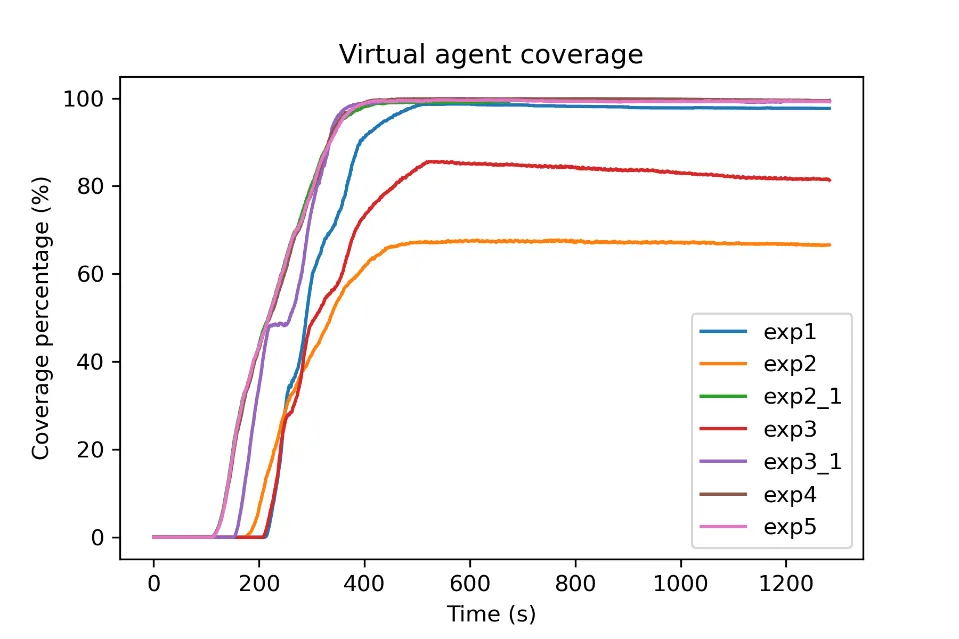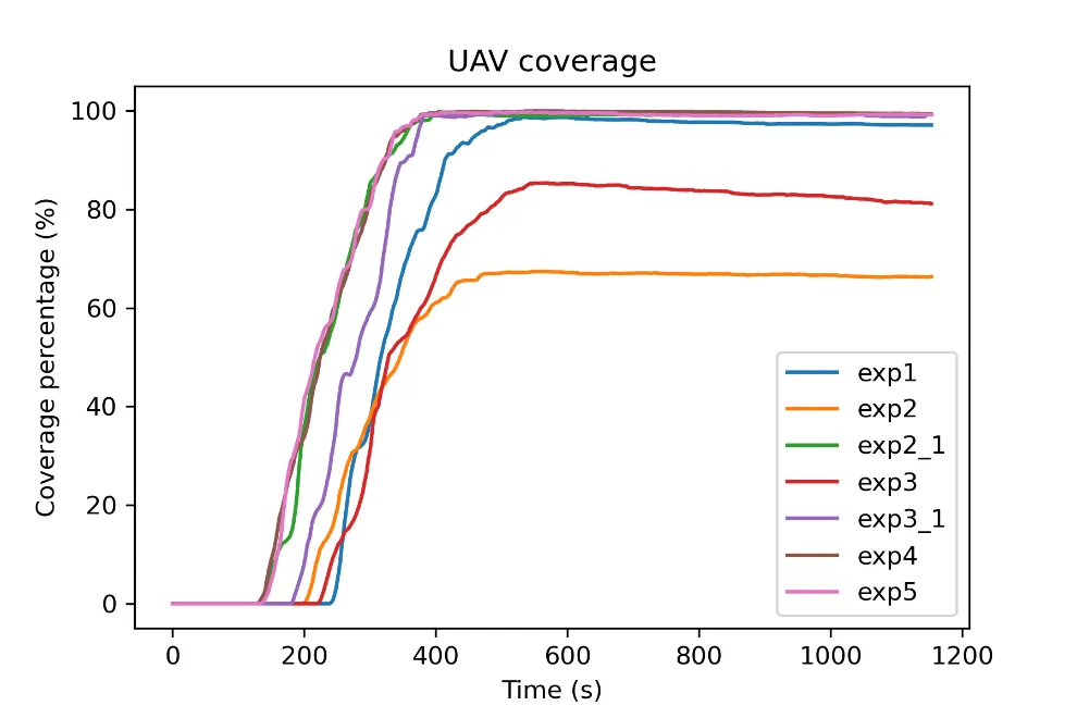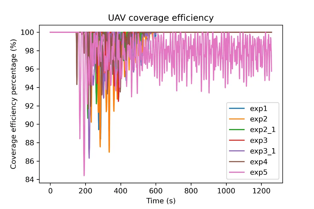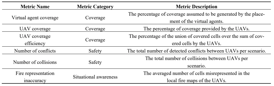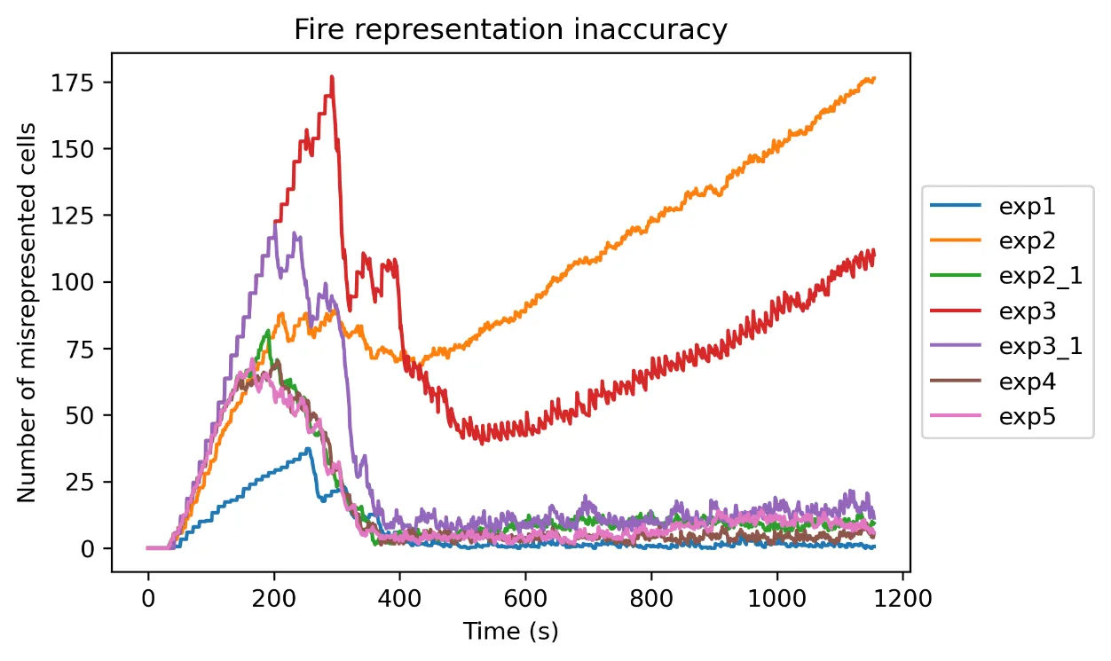 The results of experiments 1–3_1 demonstrate the efficiency of the system in covering the area of interest and maintaining an updated representation of the fire. The virtual agent and UAV coverage reached near 100% values for experiments 1, 2_1, 3_1, and the fire representation inaccuracy remained very low throughout the experiment. The number of UAVs proved to be insufficient for experiments 2 and 3, as the four UAVs were not able to completely cover the larger fire sizes of those experiments. Experiments 4 and 5 show the importance of collision avoidance and UAV synchronization respectively. The comparison of experiment 4 to the rest of the experiments in regards to the safety metrics exhibits the positive effect of the collision avoidance component on the safety of the UAVs, as it significantly reduces inter-vehicle collisions. Furthermore, the results of experiment 5 on the UAV coverage efficiency metric report on the effectiveness of the UAV synchronization methodology and its importance.