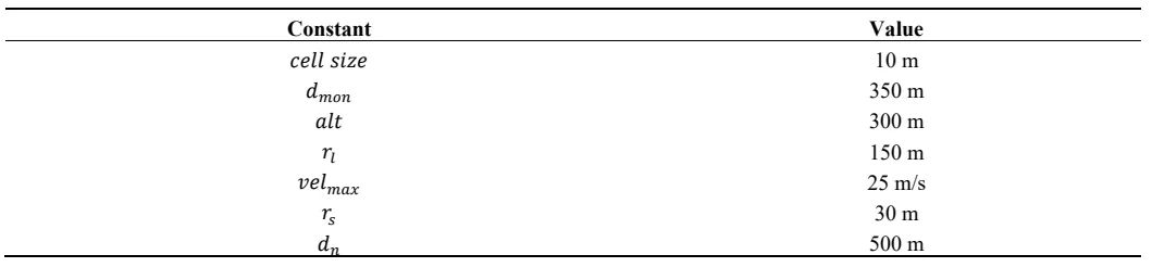 camanglehor = 1.047 rad, and a flight altitude of 300 m, then the FOV has a width of 305.65 m, and the ideal loiter radius to maximize the coverage is selected at 150 m (the loiter radius is selected to be slightly lower than the maximum allowed value of 152.8 m), resulting in a coverage radius of 302.8 m.