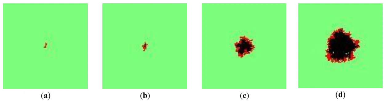 . The fire spreading at different time steps of the simulation. (<b>a</b>) Time step 50, (<b>b</b>) Time step 100, (<b>c</b>) Time step 300, (<b>d</b>) Time step 500.