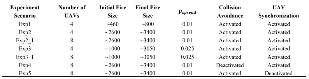 Future research should conduct more extensive scalability testing and proceed into real-world experiments. The experiments conducted for this work were limited to systems with up to eight UAVs due to processing power limitations. Further testing is required to validate the system’s performance and convergence with larger numbers of UAVs. Moreover, the proposed system was tested in SITL simulations for the purposes of this work. Real-world testing is expected to provide more insights into communication issues (e.g., temporal loss of communications) and sensor processing uncertainties (e.g., low confidence in fire detection or low fire localization accuracy), which shall guide the system’s further development.