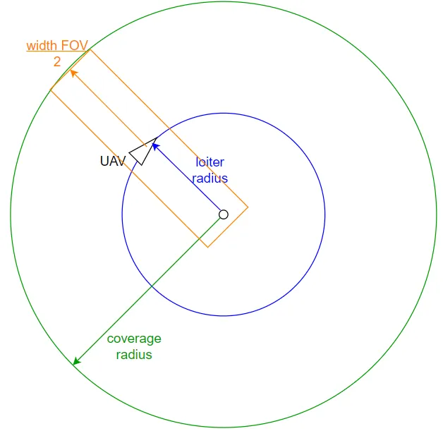 Once the formation algorithm has converged, the UAVs loiter over static positions. In order to provide full coverage over the loitering area the loiter radius of the UAV must be smaller than half the width of the camera’s FOV. As shown in , during a full rotation the UAV covers a circular area with a radius of:
