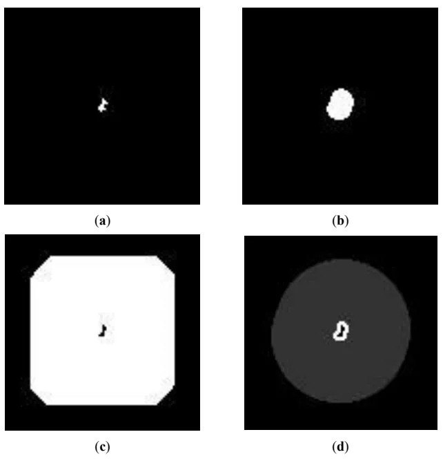 . Examples of the four types of maps as grey scale images. (<b>a</b>) The fire map, with the fire depicted in white, (<b>b</b>) The fire augmentation map, with the augmented fire depicted in white, (<b>c</b>) The virtual agent area map, with the virtual agent area depicted in white, (<b>d</b>) The monitoring area map, with the cells with highest priority (of 1) depicted in white, and the cells with lower priority (of 0.2) depicted in grey.