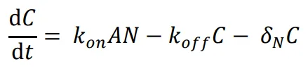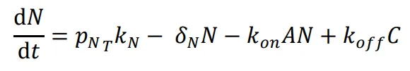 τ* = *A*(*t* − *τ*) is the mature repressor, *τ* is the maturation delay, *N* is the free NanoDeg, and *C* is the complex that forms upon association of the NanoDeg and the mature repressor *A