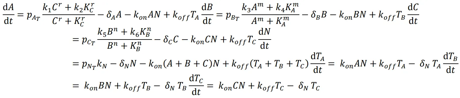 where *A*, *B*, and *C* are the concentrations of the three unbound repressors connected in series, *N* is the concentration of the unbound NanoDeg, *T