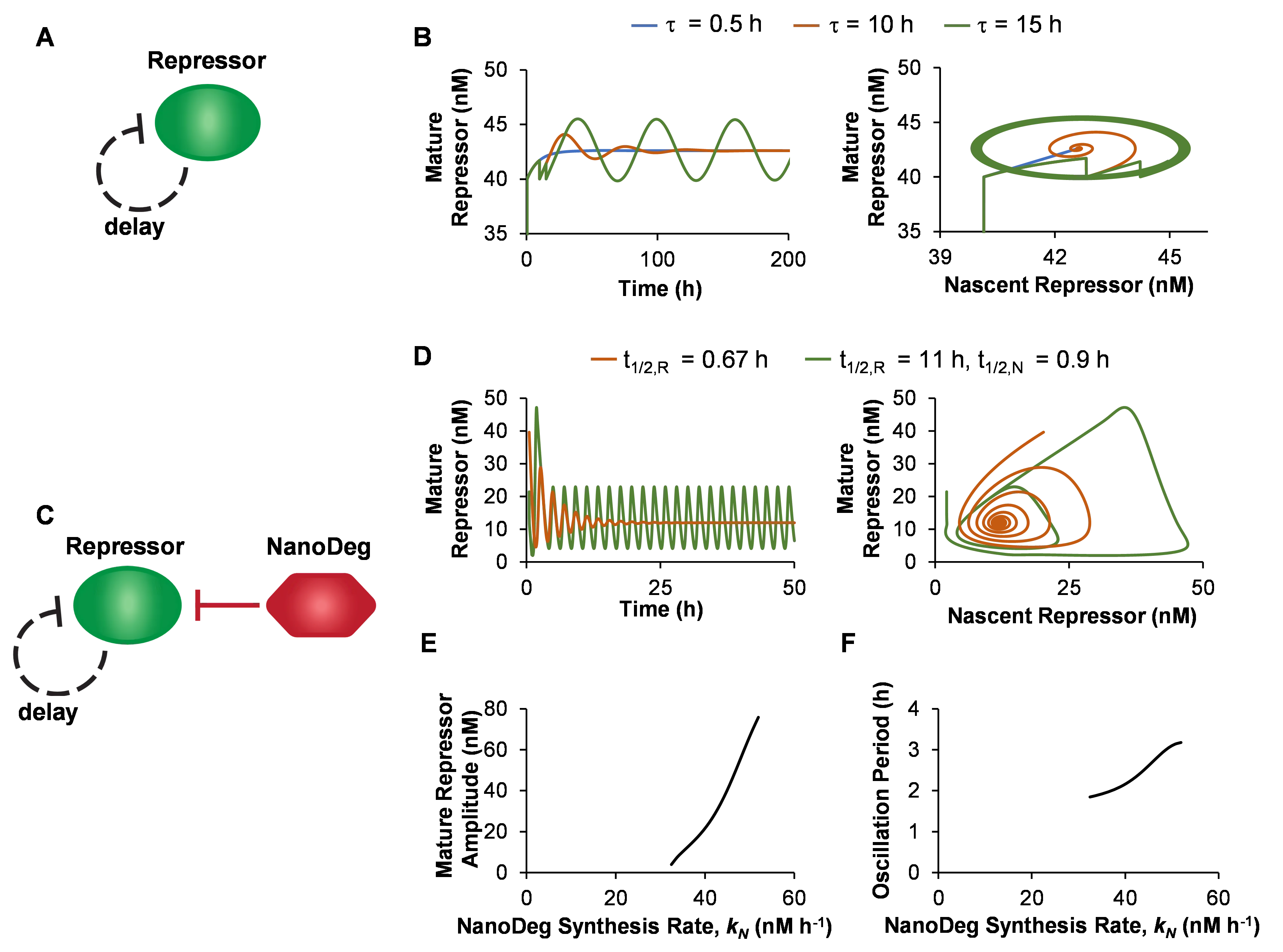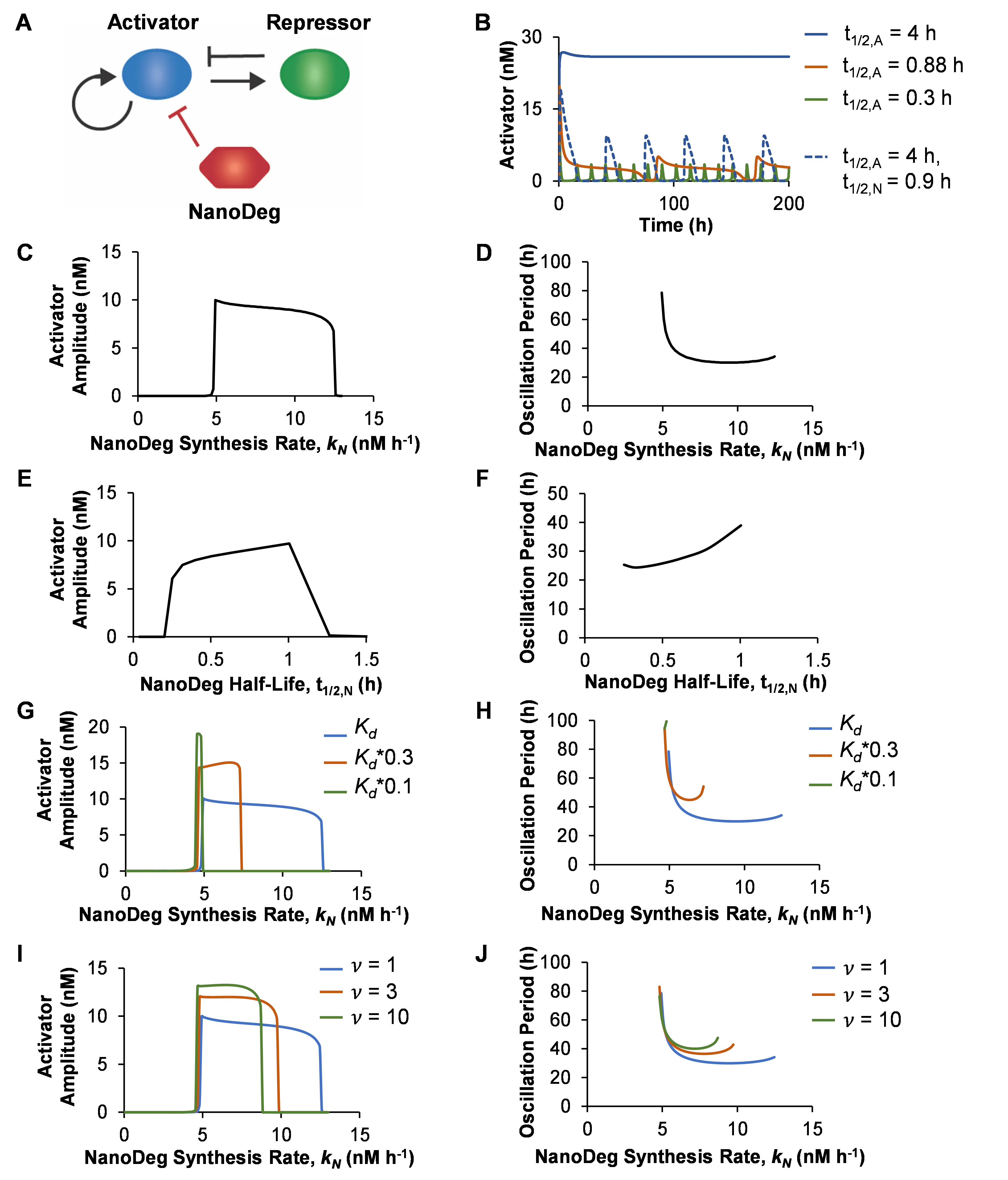 34]. Decreasing the half-life of the activator to generate a timescale separation results in onset of oscillations. For the chosen parameters, oscillation is triggered by lowering the half-life of the activator to at least 0.88 h (B, red), with shorter activator half-lives increasing the frequency of oscillation (B, green). Such a drastic alteration in a protein’s half-life would be challenging to achieve experimentally, as it requires substantial modification of inherent protein properties, including fusion to protease-sensitive tags or protein engineering to alter protein stability. The separation of timescales required for oscillation, however, could be easily achieved through the co-expression of an activator-specific NanoDeg. Because the introduction of the NanoDeg into the system is expected to enhance the degradation rate of the target proportionally to the NanoDeg half-life [