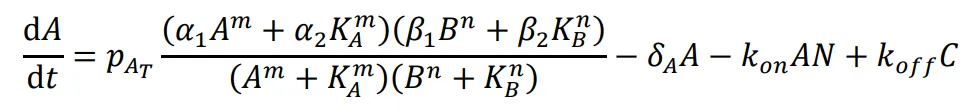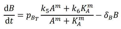 B*) and rate of synthesis regulated by A following a Hill function with the Hill coefficient (m), the maximum rate of synthesis (*k*