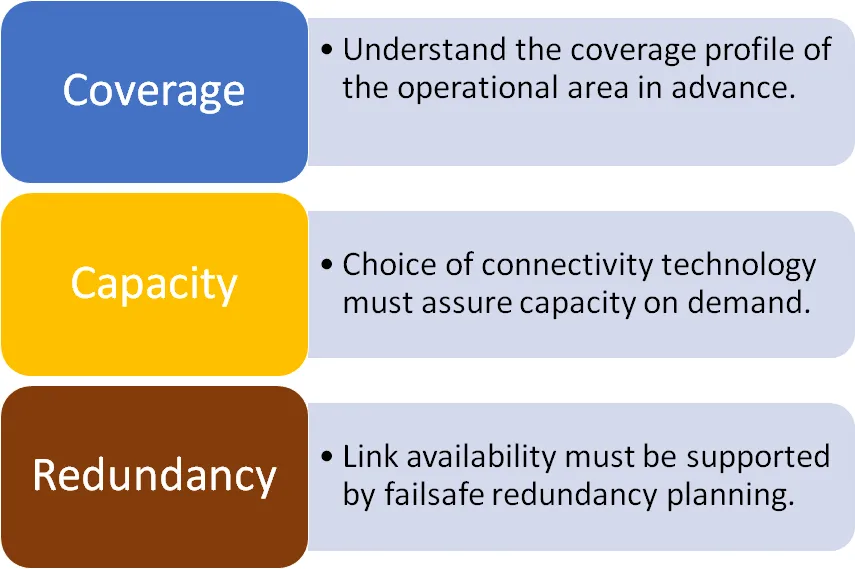 BVLOS operations are contingent on reliable connectivity and coverage, as outlined earlier. Due to the mission-critical nature of some UAS operations, command and control (C2) and other critical messages must be delivered reliably and securely. The regulators are always keen to establish how UAS operators will guarantee the availability of critical links throughout the flight. Failsafe connectivity is one way of addressing the requirements of ensuring the availability of reliable communications for BVLOS operations. This connectivity consideration consists of three main elements: Coverage, Capacity and Redundancy, as shown in .