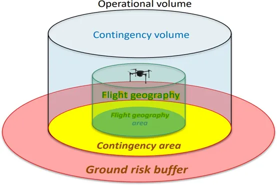 8]. To operate under the “specific” or “certified” categories like BVLOS, EASA requires the UAS to be operated within a defined geographic zone or safety buffer (see ). This restriction or confinement to a well-defined geographical zone or operating area mitigates conflict with other aircraft and third parties. In addition to geographical deconfliction requirements, risk assessment, training and specific technical capabilities are also considered. It is important to mention that the EASA uses the risk assessment methodology known as SORA (Specific Operations Risk Assessment) to classify the risk posed by a drone flight.