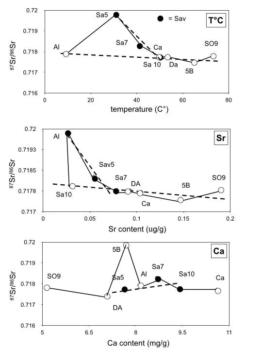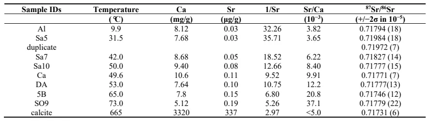 86Sr ratio when the temperature decreases from 50 to 30 °C. This negative correlation with the temperature suggests a mixing of waters at various temperatures and with various Sr isotopic ratios. The