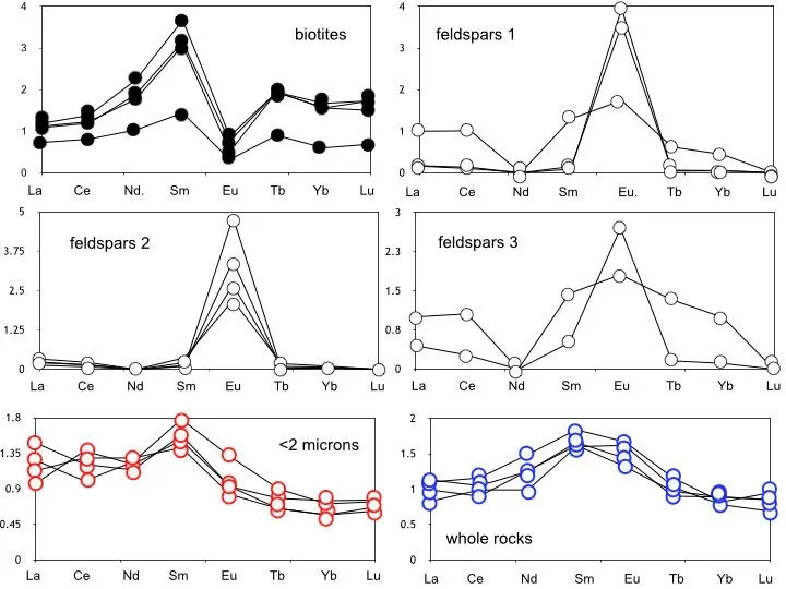 . Rare earth elemental patterns of the separated feldspars, biotites, <2 micron fractions and whole rocks from Plombières granite relative to the Post-Archean Australian Shales reference.